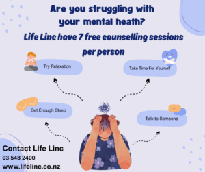 Are you struggling with your mental health? Life Linc have 7 free counseling sessions per person. 03 548 2400 www.lifelinc.co.nz